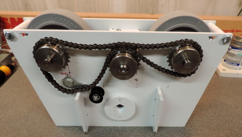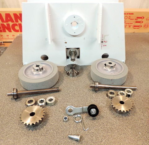 | Below: We've already mounted the P60 Gearbox/Motor assembly in order to verify the shell assembly would fit, Right: these are the remaining parts that need to be installed to complete the drive. I've disassembled the chain tensioner in order to assemble it. It's got to go in first. The Wheels will block access to the internal mounting nut. | |
