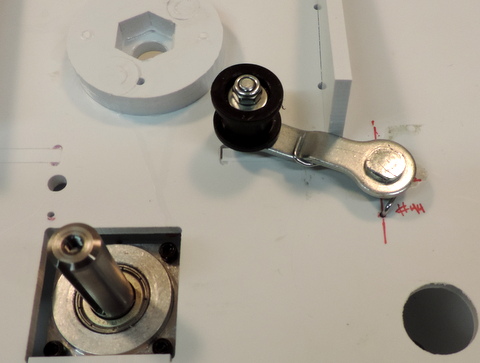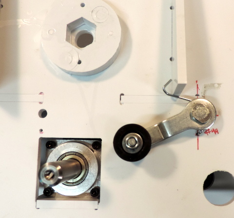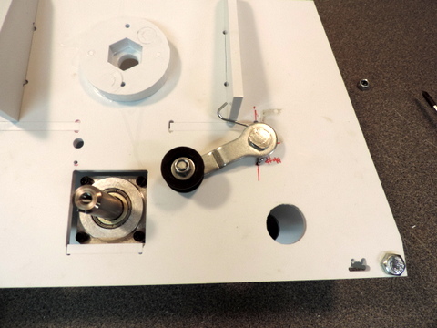 | Left: Install the tensioner spring, tensioner arm and the Mounting Shaft/Bolt. Note the flats on the shaft. Above: from the inside install the nylon insert lock nut supplied with the tensioner & tighten. | |