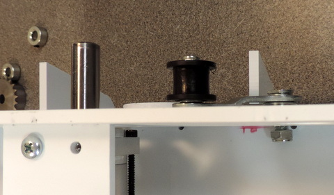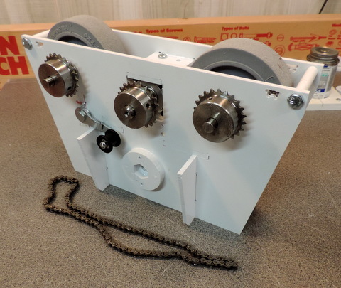 | Left: the sprockets should be .5 inch from the surface of the drive. Above: Drape the chain over the sprockets. Then raise the tensioner and slip the chain over it. | |