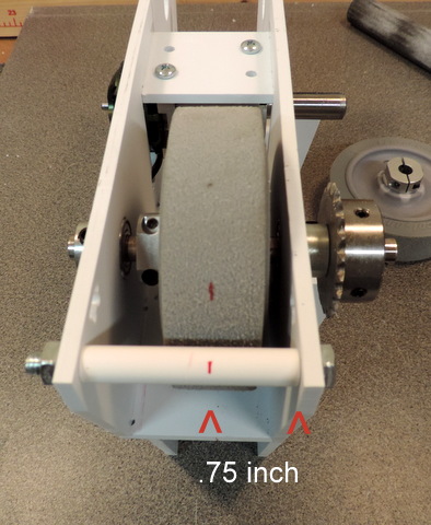 bearings - flanges on the outside. Right: thread the components (L to R: shaft, shaft collar, wheel, shaft collar, sprocket) onto the shaft. Make alignment marks as shown. It's easier if you line up all the set screws as you are putting the parts together. | |
