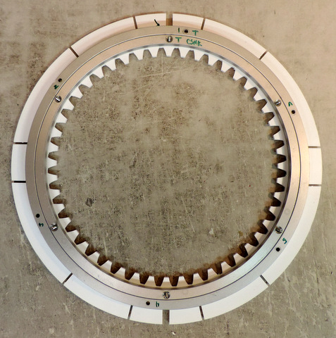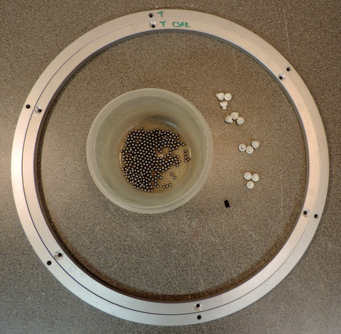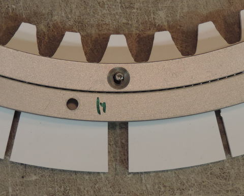 Above: This is a VXB website picture of the bearing. It's misleading, there are actually 6 holes in the inner ring. Some are blind holes. Left: I got ahead of myself and didn't take pix of the "before" version (similar to above). This is the disassembled bearing. I drilled out the holes for #10 screws and then countersunk them. Note the Markings. I added more. To re-assemble, and for alignment later on, Before You Disassemble mark inner & outer bearing races with Top & Bottom and then number the holes. From experience with R2's Rockler Bearing plan on disassembling the bearing. It's almost impossible to prevent aluminum shavings from getting into the bearing race. |