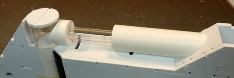 ![]() | The Leg strut is composed of 5 parts. The major three are shown to the left The central component is simply a .625 in dia cylinder. For simplicity, I'm going to cut that from an acrylic tube. The other two parts are round trim pieces that complete the appearance of a cylinder extending across the leg. (see below) The remaining Leg Strut Upper and Lower parts will be resin castings. |
